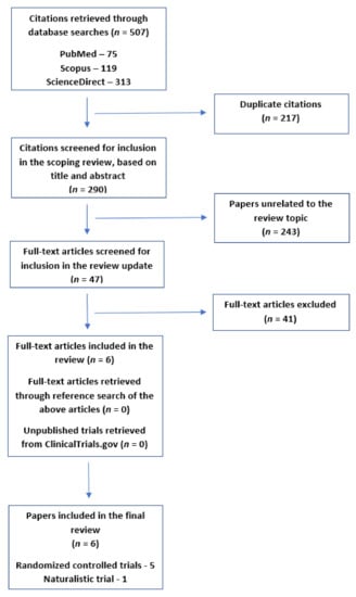 The reference lists of the studies retrieved using this method were checked for further citations of interest, but no trial fulfilling the above inclusion criteria was identified through this method. A total of six clinical trials fulfilling the above criteria were included in the current review [45,46,47,48,49,50].