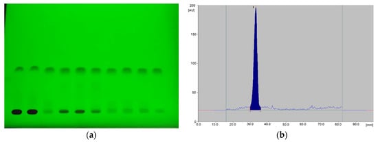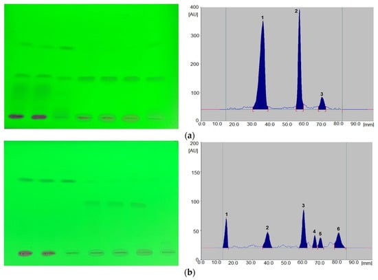 For quantitative analysis, the areas of the corresponding peaks recorded on the densitograms were used (Figure 2).