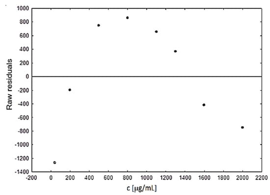 Based on the observed results, the predicted and residual values were analyzed. This enabled the verification of regression assumptions and the detection of outliers. The plot of the residuals model against the independent variable shows that the residuals are irregularly distributed (Figure 3). Thus, it can be assumed that the residuals are random, which means that the assumption of randomness is fulfilled. The designated regression equation and correlation coefficient are as follows: RR (raw residuals) = −0.7∙10-4 + 0.13∙10-6∙c and r = 0.11∙10-6.
