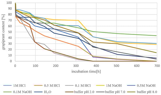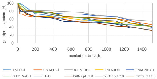 Degradation at 70 °C was carried out for 29 days (696 h). The obtained results indicate a markedly lower stability of the grapiprant in acidic solutions compared to those of basic and neutral character. In the case of using 0.1MHCl as a solvent and a buffer with pH 2, after 16 days (384 h) no test substance was found in the sample. In the case of neutral solutions, the degradation process was similar—the percentages of grapiprant at analogous time points were similar, and after 29 days the content of the tested substance was below 5.5%. For alkaline solutions, this value ranged from about 14% to almost 44% when 0.1MNaOH was used as the solvent.