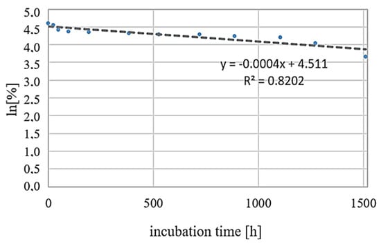 An example of ln[%]t=-kt+ln[%]0 dependence for grapiprant solution incubated in 1M HCl at room temperature.