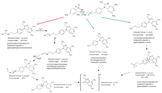 As mentioned above, degradation of the grapiprant in an acidic environment revealed the presence of several new products. The mass fragmentation pathway of the drug was established using UPLC-MS/MS data acquired in ESI positive ionization mode. The recorded chromatograms, for the standard substance solution and samples after degradation in 0.5MHCl solution, revealed several additional peaks (apart from the main peak from grapiprant; retention time, tr = 8.883 min) with tr = 2.4, 4.36 and 6.06 min (Figure S1). The mass spectra (Figure S1) show that the molecular ion peak was observed at m/z 492. Using the elemental composition calculator, the best possible molecular formulas of the fragments were determined. The obtained mass spectra of compounds formed as a result of protonated drug hydrolysis led to the formation of three main product ions: m/z 367, m/z 323 and m/z 295. Their further fragmentation led to the formation of the main ion products at m/z 174. Therefore, the probable pathway of grapiprant degradation under the tested conditions may follow the scheme in Figure 9. As mentioned earlier, the recorded densitograms showed the presence of additional peaks next to the grapiprant peak. Comparison of the respective retention coefficients (RF for TLC and tr for UPLC; Figure 4 and Figure S1) suggests that the additional peaks present in the densitogram may come from substance N-{2-[4-(2-ethyl-4,6-dimethyl-1H-imidazo [4,5-c]pyridin-1-yl)phenyl]ethyl}formamide (RF = 0.72; tr = 6.06 min, m/z 323) and from substance 2-[4-(2-ethyl-4,6-dimethyl-1H-imidazo[4,5-c]pyridin-1-yl)phenyl]ethan-1-amine (RF = 0.86; tr = 2.4 min, m/z 295). On the other hand, successive peaks formed during subsequent incubation of grapiprant samples in an acidic environment (shown in Figure 5) indicate further degradation of this substance and/or its degradants.