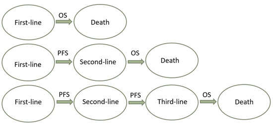 - Time-dependent surrogate endpoints include time to recurrence (TTR) and recurrence-free survival (RFS) in the setting of curative treatments, and TTP and PFS in the setting of advanced HCC. TTR and TTP are defined as the time from the start of treatment (or randomisation) to radiological recurrence or progression, respectively. TTP has been adopted as a secondary endpoint in HCC trials [14]. Although TTP is not biased by post-progression treatments and it reports the time to the event, it is unable to detect important events such as death, and it is subject to the same assessment bias as ORR [38]. RFS and PFS are composite time-dependent endpoints, often used as both primary and secondary endpoints in oncological trials. RFS is defined as the time from the start of treatment (or randomisation) to radiological recurrence or death, and it is employed in curative settings (i.e., after surgery or ablation). PFS is defined as the time from the start of treatment to radiological progression or death, and it is commonly used in the setting of systemic treatments. These are not influenced by post-recurrence or post-progression treatments and crossover bias. For these reasons, PFS could be useful to evaluate the effectiveness of sequential therapies in settings where multiple treatment lines are available. Based on this assumption, the patient’s journey could be represented as the sum of multiple subsequent PFSs of sequential treatment lines (Figure 2) [21,25,39]. The use of PFS was initially discouraged in HCC trials due to the risk of competing events and the coexistence of cancer and underlying liver disease. This problem was mitigated by including only patients with well-preserved liver function in HCC trials [40]. Overall, PFS has been used to obtain accelerated drug approval in several oncological settings [37]. It has been estimated that between 2009 and 2014, 66% of anticancer drugs approved by the FDA were approved on the basis of PFS. Most anticancer trials also use PFS as a primary endpoint, and around 50% of them have shown benefits to OS [41]. The counterpart of this phenomenon is the possibility to introduce ineffective or harmful drugs to the market, which need to be evaluated with hard endpoints in post-marketing studies [42]. For instance, a critical review of anticancer drugs approved based on PFS is crucial—not only with regard to their efficacy, but also their safety. In fact, it has been speculated that poor drug tolerance may result in imbalanced dropouts of the experimental drug, and due to informative bias this might lead to longer PFS without any improvement of OS or quality of life [38]. Time to treatment failure (TTF), defined as the time from the start of treatment to its discontinuation for any reasons (e.g., death, progression, or toxicity), has been proposed to overcome this limitation of PFS, although it is not recommended by the FDA for drug approval. This issue should be widely considered when there is no surrogacy between PFS and OS in the context of HCC, and could be particularly relevant if a competing survival event—such as hepatic decompensation with respect to tumour progression—is not usually recorded by trials [29,43]. To this end, novel endpoints aiming to measure the time to hepatic decompensation or the decompensation-free survival are needed to improve the evaluation of the net benefit of systemic treatments for HCC. To summarise, the main limitations of surrogate endpoints are the assessment bias and the need for surrogacy validation. Assessment bias might be mitigated at the trial level by using central expert radiology reviews. Validation of a surrogate endpoint is related to the ability of that endpoint to quickly and accurately predict the clinical outcome. Validation needs to be performed at both the individual and trial levels, using individual patients’ data and aggregated data, respectively [33].