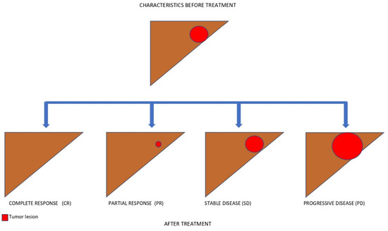 Since the most commonly used surrogate endpoints are based on radiological assessment (i.e., PFS, TTP, ORR), it is important to understand which are the features of the most commonly employed radiological criteria, both in clinical practice and in RCTs [61,62]. Ideally, cancer-related death is associated with progression in the size of the tumour and the spread of metastases. On the other hand, the goal of any cytotoxic drug is to reduce the tumour mass. Therefore, the different radiological criteria aim to assess the changes in tumour burden. This might not be sufficient in the HCC setting, particularly in the setting of systemic therapies. As discussed later in this paper, treatment with TKIs is associated with a lower probability of obtaining a neoplastic shrinkage, and the other ICIs may have unconventional patterns of radiological response, including delayed responses or pseudo-progression, manifesting first in enlargement of the tumour burden and later in radiological shrinkage [63]. Moreover, the different types of progressive disease have been found to modify the overall survival [64]. It has been shown that patients with new extrahepatic lesions or vascular invasion have a worse prognosis compared to patients whose progression is defined by new intrahepatic lesions or by enlargement of pre-existing liver nodules, either under TKIs or immunotherapy [64,65]. In addition to the adopted response criteria, overall responses are categorised as complete response (CR), partial response (PR), stable disease (SD), and progressive disease (PD), given a predefined threshold of dimensional change. The criteria differ from one another in terms of the threshold to define PR or PD, detection of the viability of the tumour, and whether they are unidimensional or bidimensional measurements. The RECIST 1.1 criteria are the globally accepted criteria in oncology. They are based on evidence derived from traditional chemotherapy studies, and they assess the response of up to five target lesions and up to two organ lesions. The maximum diameter of every target lesion is measured. The viability of the tumours is not taken into account, and they are unidimensional [66]. Some weaknesses of RECIST 1.1 include the inability to detect tumour necrosis or viability; therefore, treated lesions without arterialisation would count as SD instead of CR or PR. Due to these limitations, the EASL criteria have been proposed. Novelties of this system include bidimensionality and the fact that they can differentiate viable and non-viable tissue. Only lesions with classic arterial enhancement and subsequent washout might be considered to be active HCC [67]. In 2010, Llovet and Lencioni provided a modified version of the response evaluation criteria in solid tumours (mRECIST). This new set of criteria are unidimensional, and target lesions are considered when they have arterial enhancement, although the dimensional thresholds are similar to those of RECIST. New specifications for confounders such as ascites and lymph nodes were developed [61]. Figure 3 outlines different treatment responses according to RECIST 1.1 and mRECIST after immunotherapy. Moreover, the combination of more than one radiological criterion has been investigated to assess response to locoregional treatments (LRTs). Riaz et al. combined morphological criteria assessing tumour size (i.e., RECIST and WHO) with EASL criteria, where they evaluated tumour necrosis according to enhancement reduction. They compared the receiver operating characteristics (ROCs) of each criterion and their combination after LRTs. While combining the EASL and WHO criteria was slightly more accurate (AUC 0.85), the assessment of enhancement to predict tumour necrosis with the EASL criteria (AUC 0.82) far exceeded the accuracy of morphological evaluation (WHO AUC 0.68) [68].