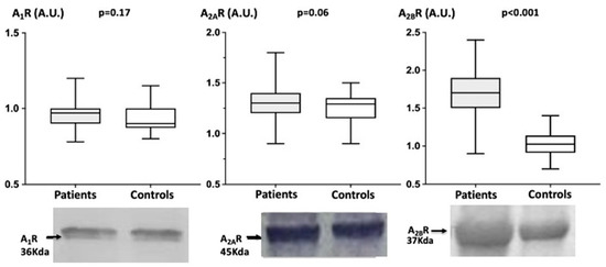 While no significant difference occurred concerning A1R or A2AR production in patients vs. controls: A1R (A.U.): Patients = 0.97 (0.78–1.20) vs. Controls = 0.90 (0.80–1.15) (p = 0.17). A2AR: Patients = 1.30 (0.90–1.80) vs. Controls = 1.29 (0.90–1.50) (p = 0.06);