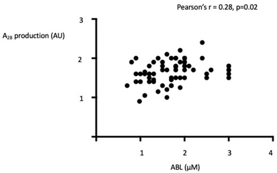 A1R: 0.9 AU vs. 0.98 p = 0.5; A2AR: 1.3AU vs. 1.3AU p = 0.49; A2B: 1.7 AU vs. 1.85AU, p = 0.5. There was no significant difference between women and men patients in ABL: median 1.7 vs. 1.9 p = 0.3 and in receptors expression: A1R: 0.9 vs. 1, p = 0.08; A2AR = 1.3 vs. 1.4 p = 0.052; A2BR: 1.7 vs. 1.8 p = 0.07. No difference appears between women and men in controls (data not shown). Finally, a correlation was found between ABL and A2B receptor expression (Figure 3).