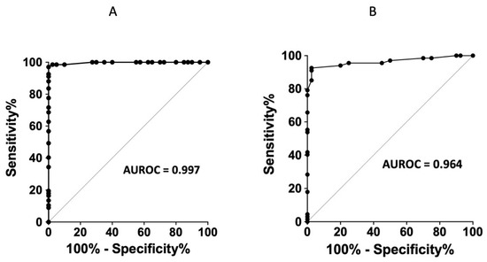 (A). Receiver-operating characteristic (ROC) curve of adenosine blood level. ROC—ABL: AUROC (CI95%) = 0.99 (0.99–1.00); p < 0.001. Threshold determination: ABL > 0.85 μmol/L: Se 97.0% (89.8–99.5%). Sp 100.0% (91.2–100.0%). (B). Receiver-operating characteristic (ROC) curve of A2BR expression in PBMCs.