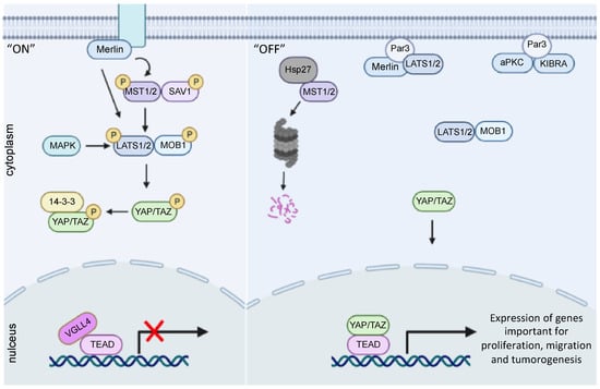 Hippo YAP/TAZ signaling pathway in early PCa. When the Hippo pathway is switched ON, phosphorylation of Mst1 and Lats1 by Merlin and MAPK leads to phosphorylation of YAP/TAZ that forms a complex with 14–3–3 protein in the cytoplasm. VGLL4 binds to TEAD binding promoters thus, blocking the expression of genes important for proliferation, migration and tumorigenesis. In the OFF condition, in early prostate tumor cells, Lats1/2 is dephosphorylated due to various mechanisms such as degradation of Mst1/2 by Hsp27, complex formation of Lats1/2 with Par3 and Merlin and dissociation of Lats1/2 and KIBRA complex by Par3. Due to blocking of physiological kinase cascade of the Hippo pathway, unphosphorylated YAP/TAZ enters the nucleus and act as co-regulator of TEAD transcription factors leading to expression of target genes.
