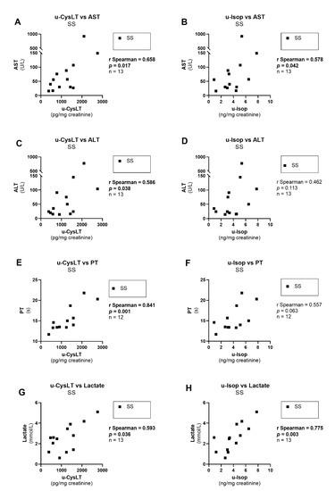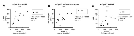 | u-CysLT (ng/mg creatinine) | 1242 (599; 1583) | 13 | 873 (758; 1842) | 7 | 1332 (484; 2368) | 5 |