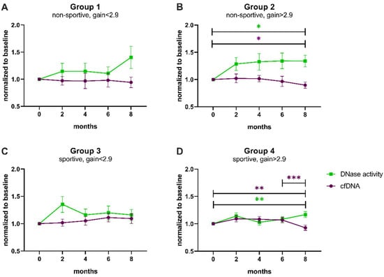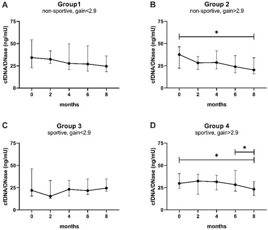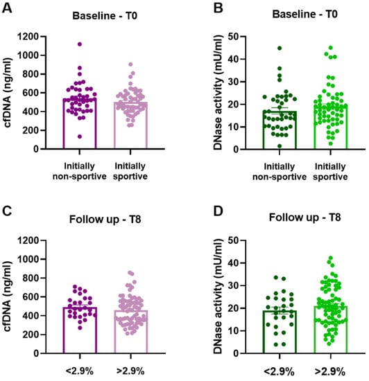 3.3. Influence of Physical Exercise on Levels of cfDNA and Activity of DNase