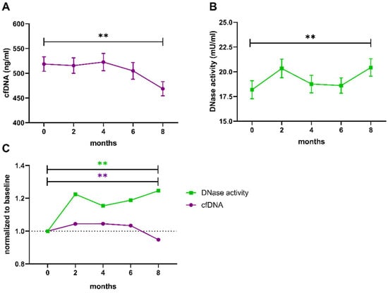 3.2. Predictors of cfDNA Levels and DNase Activity at Baseline