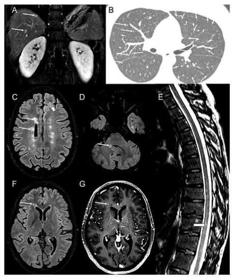 Abdominal MRI reveals hypervascular liver metastases (arrows (A)) from medullary thyroid carcinoma on coronal T1 post-contrast administration image (A). Chest CT (B) shows multiple micronodular lung metastases (arrows (B)). Brain MRI reveals multiple hyperintense and demyelinating lesions on axial FLAIR images (C,D) in the periventricular white matter (arrows (C)), in the subcortical white matter (thick arrow (C)), and in the right middle cerebellar peduncle (arrow (D)). There is also a lesion (thick arrow E)) in the thoracic spinal cord, as seen in the sagittal T2 image (E). One lesion seen on axial FLAIR image (F) near the frontal horn of the right lateral ventricle (arrows (F,G)) enhances axial T1 post-contrast image (G).