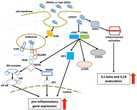 Schematic representation of cell-free DNA sensing and consequent pathway activation. Class III PI3K promotes the internalization of cfDNA and CpG-ODNs into TLR9-containing endosomal vesicles. The intracytoplasmic activation signal is transmitted via the interaction of cfDNA and TLR9. MyD88 is recruited to the Toll–interleukin-1 receptor domain of TLR9, followed by the activation of the IRAK–TRAF6 complex. This activates both the MAPK and the inhibitor of IKK complexes, resulting in the overexpression of transcription factors, such as NF-kB and AP1. cGAS-mediated detection of cytosolic DNA initiates a STING-dependent reaction. The cGAS-STING pathway can also activate IRFs, mTOR, STAT6, and MAPK in a direct or indirect way. In the cytosol, AIM2 binds to the double-stranded DNA, resulting in the creation of the AIM2 inflammasome. This results in the activation of caspase 1, the maturation of proinflammatory cytokines IL-1β and IL-18, and finally pyroptosis. AP1: activator protein 1; red arrows: upregulation.