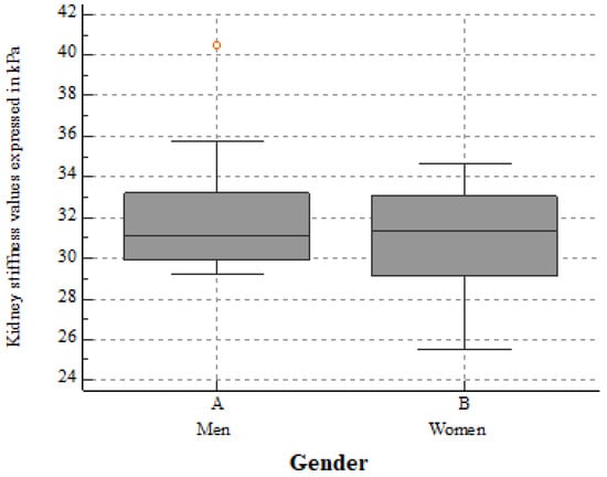 For the whole group, the mean kidney elasticity was 31.88 ± 2.89 kPa, and the mean viscosity was 2.44 ± 0.57 Pa.s for a mean measurement depth of 4.58 ± 1.02cm. eGFR seemed to influence both the 2D-SWE PLUS (r = 0.6101, p < 0.0001) and Vi Plus (r = 0.4057, p = 0.0038) values. We also found a negative correlation between age and eGFR (r = −0.8521, p < 0.0001) and a positive correlation between the median measurements of the 2D-SWE PLUS and Vi PLUS values with an r = 0.2892, p = 0.0417. No statistically significant differences between genders were noticed: the mean kidney stiffness values in men were 32.03 ± 2.84 kPa, slightly higher than the mean stiffness values in women at 31.08 ± 2.5 kPa (p = 0.2185) (Figure 2), while the mean viscosity values in men were 2.49 ± 0.47 Pa.s, a bit lower than that in women at 2.52 ± 0.79 Pa.s (p = 0.8964) (Figure 3).