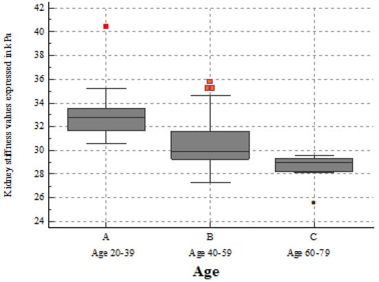 The mean kidney stiffness value was 31.88 ± 2.89 kPa, and the mean viscosity value was 2.44 ± 0.57 Pa.s. As a result, a 2D-SWE PLUS measurement of around 31.88 kPa and a Vi PLUS value of around 2.44 Pa.s are indicative of a healthy kidney free of fibrosis or inflammation. Age appears to have an effect on renal stiffness; deterioration is a physiological process of cellular and organ senescence, and, therefore, it is linked with structural changes in the kidneys. A potential explanation for the decrease in stiffness with advanced age could be the fact that renal blood flow decreases with age due to these structural changes. The mean 2D-SWE PLUS and Vi PLUS measurements decreased with age but were unaffected by the participant’s sex. In addition, we also published a study on kidney transplant recipients evaluated using the same elastography measurements in which we obtained a cut-off value of 27.3 kPa for estimating an eGFR of under 60 mL/min/1.73 m2, and this also indicated that, when the disease advances, renal stiffness declines [23].