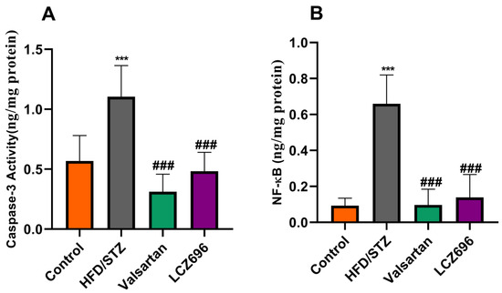 The effects of LCZ696 and valsartan treatment on caspase-3 activity (A) and NF-κB (B) in HFD/STZ-induced diabetic rats. The data are expressed as the mean ± SEM, n = 6, *** p < 0.001 versus control; ### p < 0.01 versus HFD/STZ. Abbreviations: NF-κB, nuclear factor kappa-B.