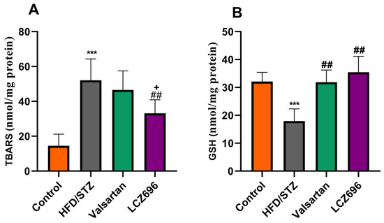The effects of LCZ696 and valsartan administration on renal oxidative stress markers in HFD/STZ-induced diabetic rats, including thiobarbituric acid reaction substances (TBARs) (A) and glutathione (GSH) (B). The data are expressed as the mean ± SEM, n = 6, *** p < 0.001 versus control; ## p < 0.01 versus HFD/STZ; + p < 0.05 versus valsartan.