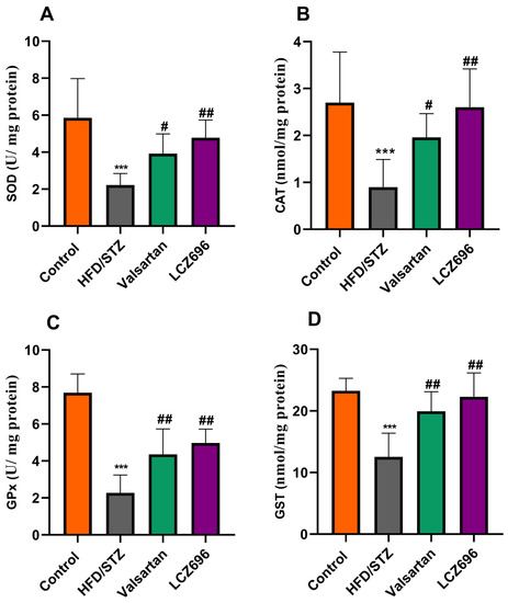 The impact of LCZ696 and valsartan treatment on the renal antioxidant status of HFD/STZ-induced diabetic rats, including superoxide dismutase (SOD) levels (A), catalase (CAT) activity (B), glutathione peroxidase (GPx) (C), and glutathione-S-transferase (GST) (D). The data are expressed as the mean ± SEM, n = 6, *** p < 0.001 versus control; # p < 0.05, ## p < 0.01 versus HFD/STZ.