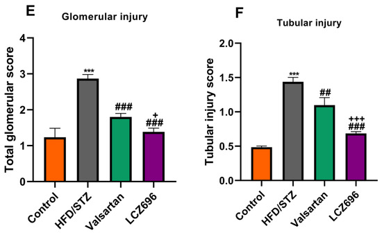 Renal cortex photomicrographs of H&E-stained kidney sections from control (A), HFD/STZ-induced rats (B), valsartan-treated group (C), and LCZ696-treated animals (D). The renal cortex of the control group displays normal proximal convoluted tubules (PT), distal convoluted tubules (DT), Bowman’s capsule, and glomerulus structures (G). The renal cortex of animals given HFD/STZ exhibited enlargement of the urinary space, thickening of the basal membrane of the glomerulus (arrow), and infiltration of inflammatory mononuclear cells (head arrow). Glomeruli and renal tubules were significantly improved in the renal cortex of HFD/STZ rats treated with valsartan and LCZ696. Damages to the glomeruli (E) and tubules (F) in the kidneys of rats from different groups were assessed semi-quantitatively, data are presented as mean ± SEM, n = 6, *** p < 0.001 versus control; ### p < 0.001 and ## p < 0. 01 versus HFD/STZ; + p < 0.05 and +++ p < 0.001 versus valsartan. H&E, scale bar = 50 µm.