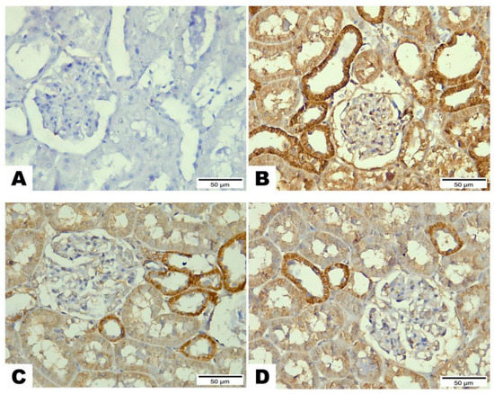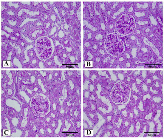 The kidneys that were harvested were fixed in 10% formalin, dehydrated, and then embedded in paraffin wax. The sections (5–7 m) were cut with an automated microtome (Leica RM 2125 RM, Leica Microsystems, Nussloch, Germany) and mounted on glass slides. All slides were stained with hematoxylin and eosin (H&E) and periodic acid–Schiff (PAS) and examined by an experienced pathologist using a light microscope, the Nikon Eclipse E600, and a digital high-resolution camera. Briefly, 20 glomeruli per section were scored to determine the average glomerular injury index per rat, with a score of 0 for intact glomeruli, 1 for less than 25%, 2 for 25–50%, 3 for 50–75%, and 4 for >75% damage. The score for tubular damage was as follows: 0 = normal histology; 1 = tubular cell enlargement, brush border loss, nuclear condensation, and up to one-third nuclear loss; 2 = as in 1, but greater than one-third and less than a two-thirds nuclear loss in tubules; and 3 = greater than two-thirds nuclear loss. Each group had three randomly selected visual fields evaluated blindly by two researchers. Kidney sections stained with PAS were utilized in a glomerulosclerosis demonstration in which 20 glomeruli were randomly selected from each section and positive signals within the selected glomerulus were highlighted, measured, and represented as a percentage of the entire glomerulus’ positive area as previously described [29].