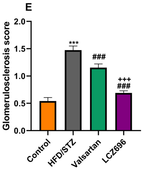 Representative photomicrographs of glomeruli stained with periodic acid–Schiff (PAS, scale 50 µm) from control (A), HFD/STZ (B), valsartan-treated group (C), and LCZ696-treated animals (D). The dark purple color in the glomerulus is the extracellular matrix. In different groups, the area of the glomerular matrix was measured (E). Data are presented as mean ± SEM, n = 6, *** p < 0.001 versus control; ### p < 0.001 versus HFD/STZ; +++ p < 0.001 versus valsartan.