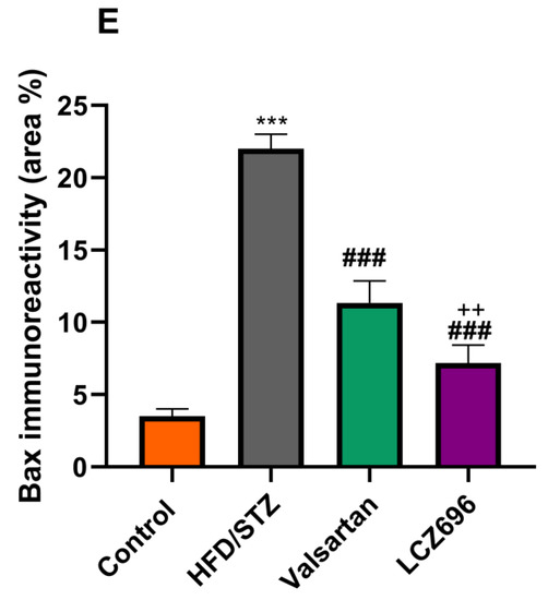 The effects of LCZ696 or valsartan on renal apoptosis marks in HFD/STZ-induced diabetic rats. A representative photomicrograph of renal cortex showing Bax immunohistochemistry protein distribution in different study groups. (A) control, (B) HFD/STZ, (C) valsartan-treated group, and (D) LCZ696- treated group. Area percent of immunoreactivity of Bax were quantified (E), (n = 3); data are presented as mean ± SEM, *** p < 0.001 versus control; ### p < 0.001 versus HFD/STZ; ++ p < 0.01 versus valsartan (scale bar 50 µm).
