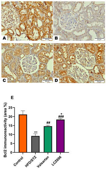 The effects of LCZ696 or valsartan on renal apoptosis marks in HFD/STZ-induced diabetic rats. A representative photomicrograph of renal cortex showing Bcl-2 immunohistochemistry expression in different study groups. (A) control, (B) HFD/STZ, (C) valsartan-treated group, and (D) LCZ696-treated group. Area percent of immunoreactivity of Bcl-2 were quantified (E), (n = 3); data are presented as mean ± SEM, *** p < 0.001 versus control; ## p < 0.01 and ### p < 0.001 versus HFD/STZ; + p < 0.01 versus valsartan (scale bar 50 µm).