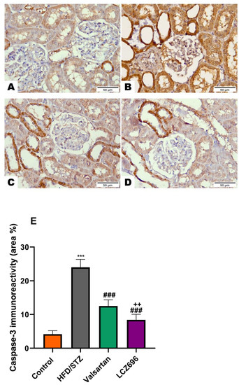 The effects of LCZ696 or valsartan on renal apoptosis marks in HFD/STZ-induced diabetic rats. A representative photomicrograph of renal cortex showing caspase-3 immunohistochemistry expression in different study groups. (A) control, (B) HFD/STZ, (C) valsartan-treated group, and (D) LCZ696- treated group. Area percent of immunoreactivity of caspase-3 were quantified (E), (n = 3); data are presented as mean ± SEM, *** p < 0.001 versus control; ### p < 0.001 versus HFD/STZ; ++ p < 0.01 versus valsartan (scale bar 50 µm).