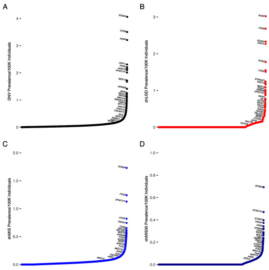 Prevalence of DNVs by gene extrapolated from number of cases in DD/ID cohort. Genes are indicated along the x-axis, with prevalence of each variant type on the y-axis. (A) DD/ID DNV cases, (B) DD/ID dnLGD cases, (C) DD/ID dnMIS cases, and (D) DD/ID dnMIS30 cases. The proportion of each gene and mutation type in our cohort was multiplied by the estimated prevalence of DD (DD/ID) from Zablotsky and Black, 2020.