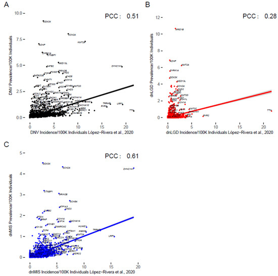 For all DNVs in NDDs, there was a significant positive pairwise correlation between the incidence from López-Rivera et al. (Pearson’s correlation coefficient (PCC) = 0.51 (95% CI: 0.5–0.53, p < 0.0001)) (Figure 4A). The dnLGD and dnMIS variants for all NDDs were also significantly positively correlated to the López-Rivera et al. estimates (PCC = 0.3: p > 0.0001 (95% CI: 0.26–0.3) and PCC = 0.6, p < 0.0001 (95% CI: 0.6–0.63)), respectively (Figure 4B,C). For all DNVs and dnMIS variants, NDD candidate genes’ prevalence was significantly correlated with previous incidence estimates (Figure S1, Table S6). No genes had a significantly different prevalence of mutation when using Bonferroni or FDR correction.