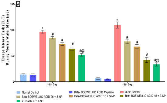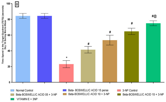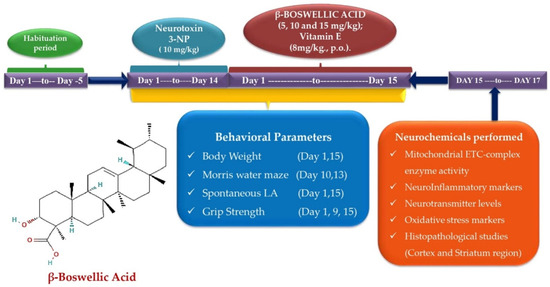 The total number of days of the experiment was 15. A total of 42 Wistar male rats aged 8–9 months with a body weight of 220–250 g were required for conducting the protocol schedule. Rats were placed in polycyclic cages with wire mesh tops along with the soft, sterilized and residue-free wood saving with free food and water access. The animals were kept under controlled conditions with a 12 h light–dark cycle, controlled temperature (22.2 °C), controlled humidity (65–70%), and free access to food and water. The effect of the circadian rhythm was minimized by performing experiments from 9:00 a.m. to 1:00 p.m. The researcher performed an unblinded preclinical study on rats. Animals were randomly divided into seven groups as follows: Group 1: normal control; Group 2: Βeta-BOSWELLIC ACID (15 mg/kg/day, p.o.) perse; Group 3: 3-NP control (10 mg/kg/day, i.p.); Group 4: Βeta-Boswellic ACID (5 mg/kg/day, p.o.) + 3-NP (10 mg/kg/day, i.p.); Group 5: Βeta-Boswellic ACID (10 mg/kg/day, p.o.) + 3-NP (10 mg/kg/day, i.p.); Group 6: Βeta-Boswellic ACID (15 mg/kg/day, p.o.) + 3-NP (10 mg/kg/day, i.p.); Group 7: Vitamin E (8 mg/kg, p.o.) + 3-NP (10 mg/kg/day, i.p.) (Figure 1).