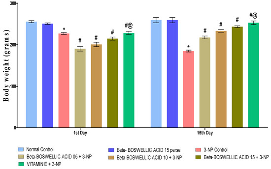 Each rat’s body weight was measured on the first and last days of the protocol schedule. Body weight was calculated to evaluate changes in food and water intake in rats following the administration of 3-NP, along with various dosages of β-BA and conventional medication (vitamin E). Body weight was calculated as the percentage of change in the body weight of rats from the 1st day of the protocol to the last day, i.e., the 15th day of the treatment [40].