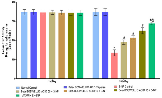β-Boswellic acid ameliorates locomotion activity on actophotometer in3-NP-induced HD in rats. The Bonferroni two-way ANOVA and Tukey’s one-way ANOVA post-hoc test was used to express significant statistical data as mean ± SD (n = 6); * 3-NP (p < 0.01) versus normal and β-BA perse; # β-BA5 + 3NP, β-BA10 + 3NP, and β-BA15 + 3NP (p < 0.01) versus 3-NP; #@ vitamin E + 3NP (p < 0.01) versus β-BA5 + 3NP, β-BA10 + 3NP, and β-BA15 + 3NP.