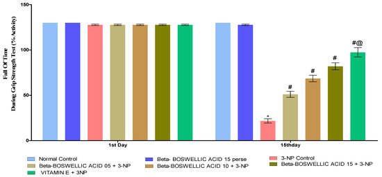 β-Boswellic acid ameliorates grip strength during grip strength task 3-NP-induced HD in rats. The Bonferroni two-way ANOVA and Tukey’s one-way ANOVA post-hoc test was used to express significant statistical data as mean ± SD (n = 6); * 3-NP (p < 0.01) versus normal and β-BA perse; # β-BA5 + 3NP, β-BA10 + 3NP, and β-BA15 + 3NP (p < 0.01) versus 3-NP; #@ vitamin E+ 3NP (p < 0.01) versus β-BA5 + 3NP, β-BA10 + 3NP, and β-BA15 + 3NP.