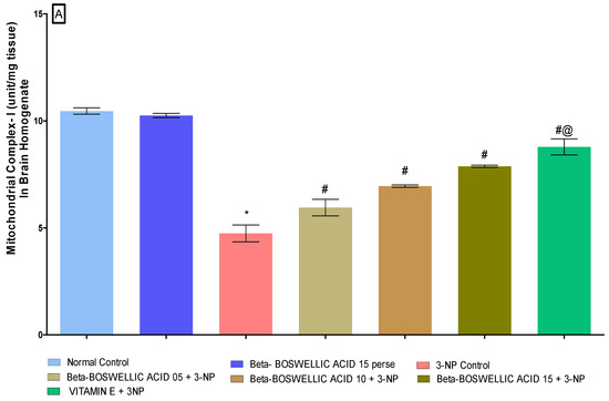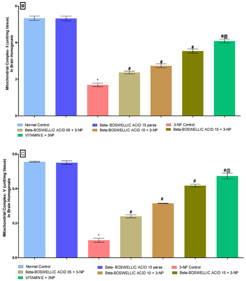 (A–C): β-Boswellic acid ameliorates mitochondrial ETC complexes activity in brain homogenates of 3-NP-induced HD in rats. The Bonferroni two-way ANOVA and Tukey’s one-way ANOVA post-hoc test was used to express significant statistical data as mean ± SD (n = 6); * 3-NP (p < 0.01) versus normal and β-BA perse; # β-BA5 + 3NP, β-BA10 + 3NP, and β-BA15 + 3NP (p < 0.01) versus 3-NP; #@ vitamin E + 3NP (p < 0.01) versus β-BA5 + 3NP, β-BA10 + 3NP, and β-BA15 + 3NP.