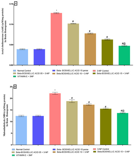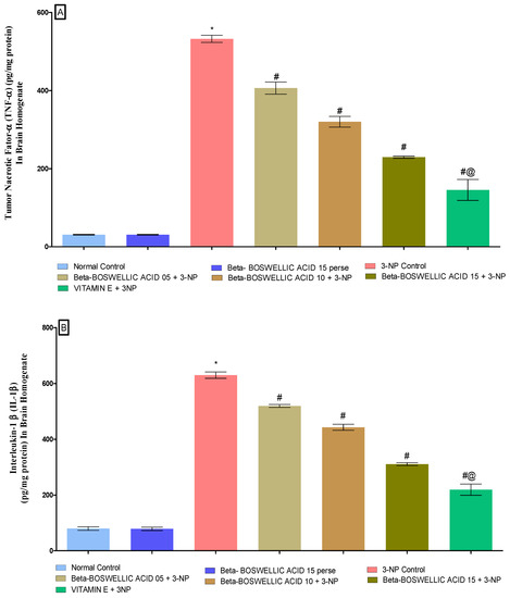 (A,B): β-Boswellic acid ameliorates inflammatory markers level in brain homogenates of 3-NP-induced HD in rats. The Tukey’s one-way ANOVA post-hoc test was used to express significant statistical data as mean ± SD (n = 6); * 3-NP (p < 0.01) versus normal and β-BA perse; # β-BA5 + 3NP, β-BA10 + 3NP, and β-BA15 + 3NP (p < 0.01) versus 3-NP; #@ vitamin E + 3NP (p < 0.01) versus β-BA5 + 3NP, β-BA10 + 3NP, and β-BA15 + 3NP.