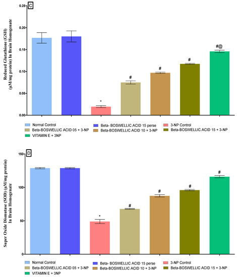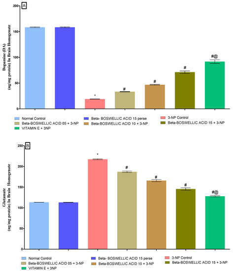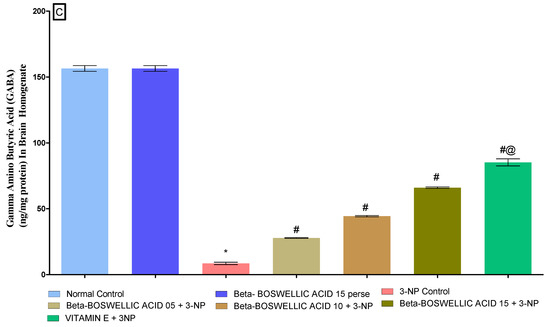 (A–C): β-Boswellic acid ameliorated neurotransmitter levels in brain homogenates of 3-NP-induced HD in rats. The Tukey’s one-way ANOVA post-hoc test was used to express significant statistical data as mean ± SD (n = 6); * 3-NP (p < 0.01) versus normal and β-BA perse; # β-BA5 + 3NP, β-BA10 + 3NP, and β-BA15 + 3NP (p < 0.01) versus 3-NP; #@ vitamin E + 3NP (p < 0.01) versus β-BA5 + 3NP, β-BA10 + 3NP, and β-BA15 + 3NP.