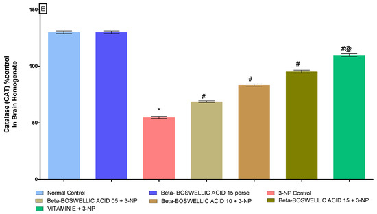 (A–E): β-Boswellic acid ameliorates the oxidative stress parameters in brain homogenates of 3-NP-induced HD in rats. The Tukey’s one-way ANOVA post-hoc test was used to express significant statistical data as mean ± SD (n = 6); * 3-NP (p < 0.01) versus normal and β-BA perse; # β-BA5 + 3NP, β-BA10 + 3NP, and β-BA15 + 3NP (p < 0.01) versus 3-NP; #@ vitamin E + 3NP (p < 0.01) versus β-BA5 + 3NP, β-BA10 + 3NP, and β-BA15 + 3NP.