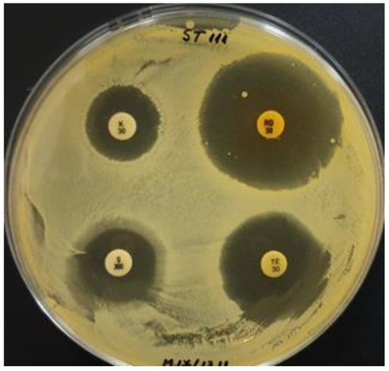 Tetracycline (30 µg/disc) was able to completely inhibit 19.3, IBB, and ST111 growth (Figure 2). For these strains, clear inhibition zones of 8–9 mm around the antibiotic disc were observed.