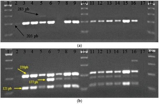 Electrophoretic pattern for multiplex PCR: (a) LBA1272, 203 pb (black arrow) and dltD, 283 pb (black arrow); (b) α-amy, 220 pb (yellow arrow); malL, 177 pb (yellow arrow); and ribA, 121 pb (yellow arrow). Samples: 1,10,18—ladder 100 pb, 2—L22, 3—L26, 4—L35, 5—LAB43, 6—L58, 7—L61, 8—BR9, 9—CR1, 11—Fv52, 12—Fv177, 13—P124, 14—ST111, 15—26.1, 16—34.9, 17—no DNA.