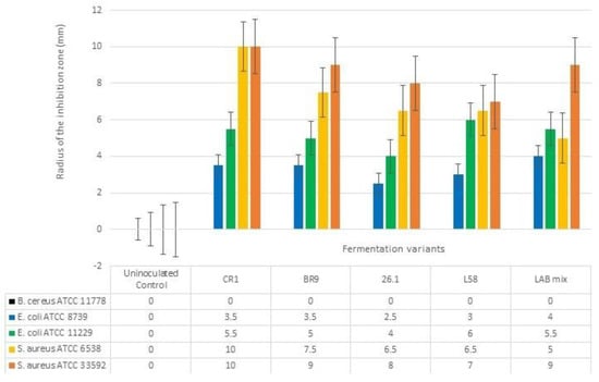Antibacterial activity of LAB is considered by other research groups to be performed by various metabolic compounds. However, the lactic acid and acetic acid had the highest inhibitory potential [].