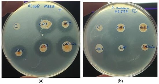 Antibacterial effect of fermented tomato juice: (a) E. coli ATCC 11229; (b) S. aureus ATCC 33592.