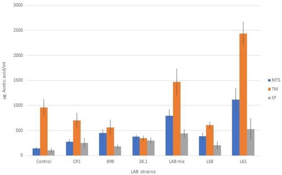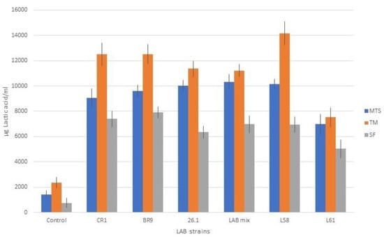 HPLC analysis for lactic and acetic acid quantification were performed on the three vegetable juices, SF, MTS, and TM. The juices were fermented for 3 days with five LAB strains, CR1, BR9, 26.1, L58, and L61, as well as with a mixture of the five, and compared with uninoculated controls.