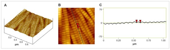 ADM image obtained with atomic force microscopy (native material): (A) 3D image of ADM; (B) “Height” image of ADM; (C) topography of the collagen fiber of the ADM according to the profile marked in Figure 1B (native material).
