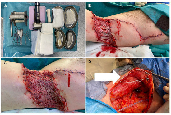 Multiple applications of ADM in Hidradenitis Suppurativa Surgery Reconstructions (own material). (A) Surgical equipment required for ADM and ADM-STSG co-graft surgery; photo shows surgical instruments—a meshing device, surgical tools, and the thawing process of our in-house ADM product; (B) ADM application to the wound (first step of co-graft); (C) Second step of co-graft—STSG fixation (STSG overlaps ADM); (D) ADM grafted to the skin flap—the ADM is pointed by an arrow and a contour (B,C) shows a 2-stage operation, which is a co-graft of ADM and STSG, (D) shows a different operation (ADM placement under the skin flap).