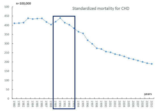 Based on data obtained from the Institute of Health Information and Statistics of the Czech Republic and those released by the Czech Society of Cardiology, acute treatment of CHD remained rather unaltered during this period [25]. Primary and secondary prevention of CHD did not change either, as no statins were available at that time and use of novel antihypertensive agents was limited. This is best illustrated by the percentages of gross national product spent on health service, i.e., 3.72, 3.35, and 3.42% in 1991, 1992, and 1993 (similar to the 1980s), changing substantially, in 1994, with the advent of health insurance companies. The fees paid by those insured (almost 100%) were shifted directly to health insurance companies and not indirectly as part of the state budget assigned to cover health service costs, whereby, the proportion of funds allocated to the health care service increased to 5.2% in 1994, and thereafter, ranged between 5 and 6%.