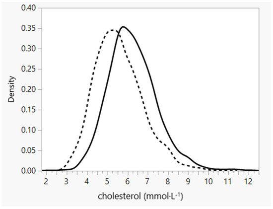 Distribution of total cholesterol levels in a 1% random population sample in 6 districts of the Czech Republic in 1988 (n = 2988—solid line) and 1992 (n = 2763—dashed line).