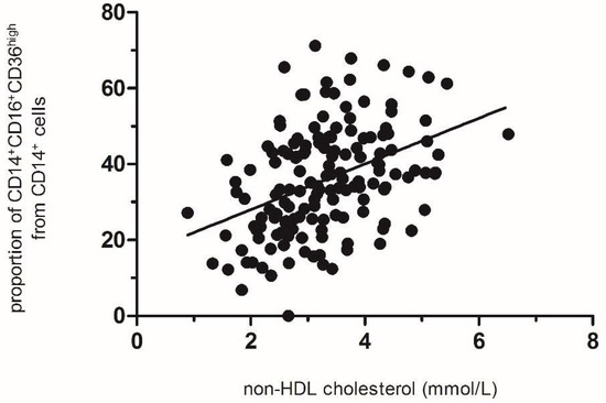 Essentially, we can divide the bulk of adipose tissue macrophages into three basic phenotypes. The proportions of PIMs in human visceral adipose tissue range between 20 and 60% of total adipose tissue macrophages characterized as CD14+, CD16+, and CD36high. Correspondingly, anti-inflammatory adipose tissue macrophages with the CD14+CD16-CD36low phenotype shows a mirror-like pattern. In addition to these two main subfractions, adipose tissue contains several intermediate subfractions representing an average 15 ± 2%. Our preliminary data [13] documented a significant positive correlation between the proportion of PIMs and non-HDL cholesterol levels in a relatively small number of LKDs. We, herein, present this correlation in 154 LKDs (Figure 3) [26]. On the one hand, the highly significant correlation demonstrated that, in individuals with low non-HDL cholesterol levels, the proportion of PIMs was about 20%. On the other hand, the proportion of PIMs in the visceral adipose tissue of hypercholesterolemic individuals (non-HDL cholesterol levels >4.5 mmol/L) was in the range of about 50–60%, i.e., almost twice to three times as high. When the proportion of PIMs was related to the level of non-HDL cholesterol in our entire group of LKDs, a very highly positive and significant correlation (p < 0.0001) with an r2 value of 0.1288 was found. As is evident from the shift of the curve of distribution of cholesterol concentrations, the decrease in the proportion of PIMs occurred in the whole population sample (Figure 3). The change in the proportion of PIMs was estimated at 18% for every 1 mmol of increase in non-HDL cholesterol levels.