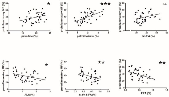 In summary, the effect of the FA spectrum in human adipose tissue on the proinflammatory status and polarization of tissue-resident macrophages was substantial. As the presence of palmitate and palmitoleate in the phospholipid fraction of adipose tissue increased, the character of adipose tissue became more proinflammatory. On the contrary, with increasing presence of α-linoleate and total n-3 FAs, the proportion of PIMs tended to decline. A very potent effect was also documented for EPA.
