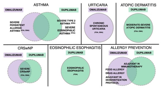 On-label indications and off-label promising uses of omalizumab and dupilumab in allergic inflammation (as of October 2022). Omalizumab is approved as an add-on treatment in severe persistent allergic asthma (FDA, EMA), similarly to dupilumab in severe type 2 asthma (EMA) and asthma with eosinophilic phenotype (FDA) or oral corticosteroid-dependent asthma, regardless of phenotype (FDA). Regarding allergic skin diseases, omalizumab is approved for the treatment of chronic spontaneous urticaria (FDA, EMA), similarly to dupilumab for the treatment of moderate-severe atopic dermatitis (FDA, EMA). Both biologics have been approved in patients with severe chronic rhinosinusitis with nasal polyps (FDA, EMA). In eosinophilic esophagitis, dupilumab has recently been approved by the FDA. Considering prevention of allergic reactions, both biologics are under investigation as adjuvant in oral immunotherapy. Omalizumab is used off-label as adjuvant in desensitization protocols to prevent breakthrough reactions. FDA denotes U.S. Food and Drug Administration, EMA European Medicines Agency.